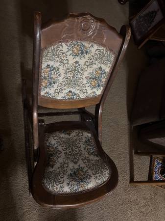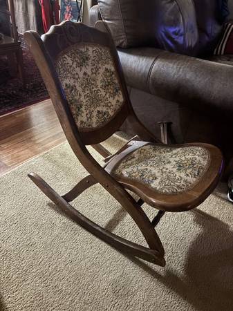 Perfect chair to pull out for the holidays. Folds for easy storage. Strong sturdy rocker. Petite size approx 14” seat off ground.