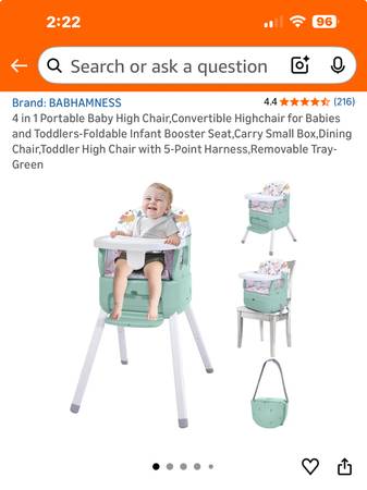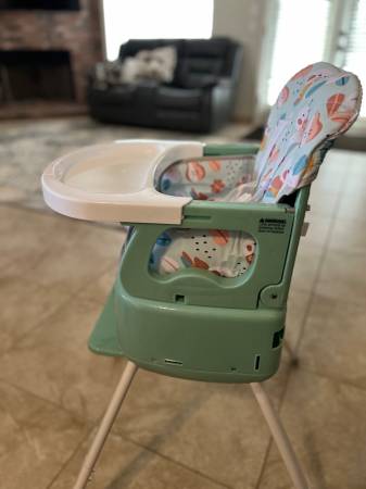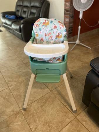 New Childs highchair. Convertible 4 in one. Transforms from highchair to toddler chair to booster seat. New. Just purchased for great grandson visited from Alaska for 2 weeks. New has been assembled...