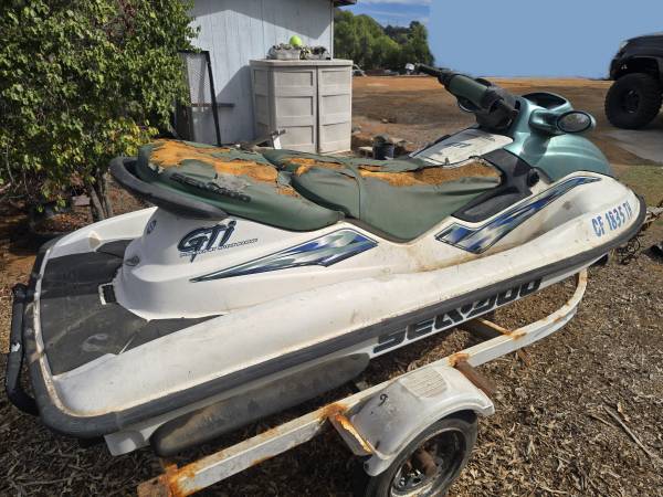 2000 Sea Doo GTi waverunner jet ski, does not run. engine is partially disassembled, no battery otherwise appears to be complete, NO paperwork on ski or trailer other than a bill of sale from me, tires are good but the right tire has a slow leak, trailer needs an axle however it was towed within the last month, located in El Cajon 92019, $150 make an offer, call or text 619 787 seven 987 Rod.