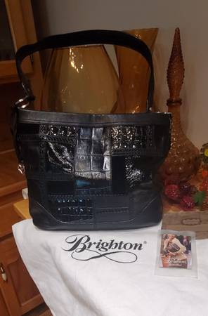 Brighton Black Leather Patchwork Satchel Shoulder Purse. Has outside zipper pocket, inside zipper pockets & multiple interior pockets. Measures 13 1/2" W x 10 1/2 H x 5" D. Comes with Brighton Dust Bag & Cards. Retails for $325. In excellent condition.