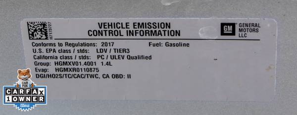 2WD / FWD Type, 4-Wheel ABS, Air Conditioning System, AM/FM Radio, Automatic Headlights, Child Safety Door Locks, Cruise Control, Daytime Running Lights, Deep Tinted Glass, Driver and Passenger Airbags, Electrochromic Exterior Rearview Mirror, Front Side Airbags, Front Side Airbags with Head Protection, Power Windows, Power Door Locks, Power Trunk Lid, Rear Window Defogger, Remote Ignition, Run Flat Tires, Second Row Side Airbags, Steel Wheels, Tachometer, Telescoping Steering Column, Tilt Steering, Tire Pressure Monitoring System, Trip Computer, Vehicle Anti-Theft, Vehicle Stability Control System. OnStar System, Rearview Camera.