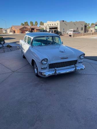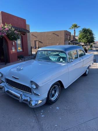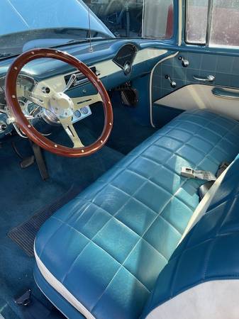 Selling my 55 Chevy 210 Del-Ray 400 engine w/ rebuilt 350 turbo transmission, all new items as follows, Battery Power steering box, chrome tilt steering column wood style steering wheel, pump and; hoses ,aluminum radiator water pump front & and; rear sway bars master cyd & booster American auto wire from fuse box to lights front suspension springs tie rods and; bushings front disc pads , leaf springs shocks bushings, rear drums and; shoes E brake cables wheels & tires fuel tank w/ sending unit and fuel pump rebuilt AVS carb radio good panel fit, car is a fun driver and shows, sorry but no trades ,Steve show contact info