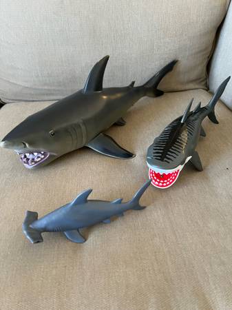 Big one about 18” long very soft plastic Middle one about 12” long hard plastic Hammer head about 7” long soft plastic 20 dlls for all Firm price Cash only