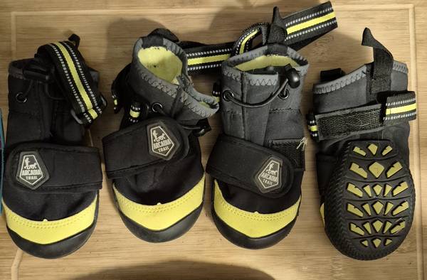 Three Different sets of dog boots and three different sizes: small, medium and large. Arcadia Trail and Climapaw. All sets are in excellent condition! All three sets for 15.00