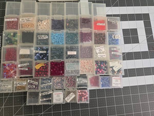 Lt blue, and a mixed color, Hematite diamond duo's, lots of pearls 4mm & 6mm, #8 Lt sapphire seed beads, mixture of bicones, Iris duo's, 8x3 Cali beads, 8mm red faceted, small red bells jingle, #8 silver rocaille, and some delicas beads. Plus carrying case.