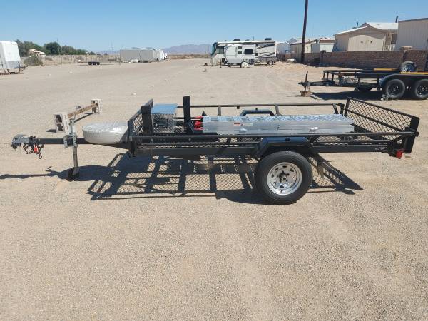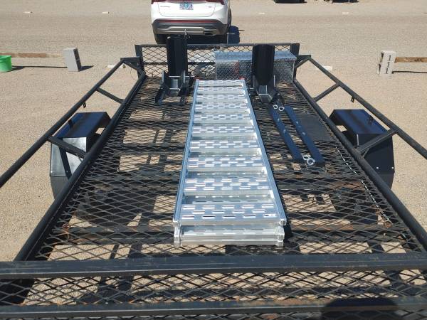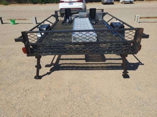 Set up with 2 removable motorcycle chocks. 4 wheeler's can be loaded from the side or back. New aluminum 50"x70" tri fold ramp. 3 new 8 ply tires & wheels. New hitch. New rear mounted stabilizing stands. 4 wheel chokes. Wheel covers. New aluminum tool box. Deck is 9'x5'.