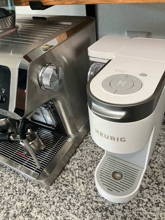 Working good as new, just don’t need it as I have the other coffee machine pictured next to it. Just downsizing. Includes the pod adapter so you can use your own coffee grounds or the keurig pods.