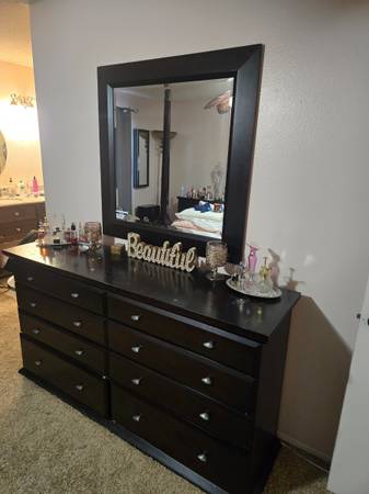 Ashley brand 5 piece bedroom set solid wood. Includes bed, dresser, nightstand, mirror. Armour