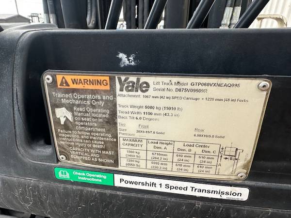 #29374 2017 YALE 6000LB PNEUMATIC TIRE FORKLIFT, 4 STAGE, QUAD MAST, FORK POSITION, SIDE SHIFT, DUEL FUEL, PROPANE AND GASOLINE MODEL: GTP060VXNEAQ095 S/N: D875V09509R $19,995.00