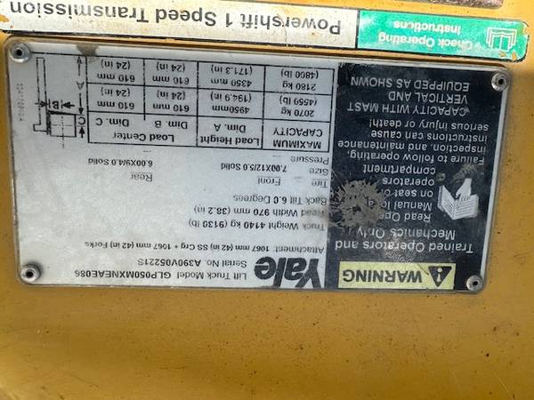 #29379 2018 YALE 5000LB PNEUMATIC TIRE FORKLIFT, 3 STAGE, SIDE SHIFT, PROPANE POWER MODEL: GLP050MXNEAE086 S/N: A390V05021S HOURS: 4689 $16,995.00