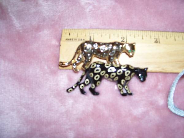 beautiful cat brouches...one is flexable to wear over your shoulder...the size can be seen with the measure tape next to them....neg.