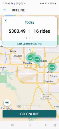 compensation:NO LIE/BEST PAY FT/PT >$100 extra on top of fares for signing up and doing 1st trip. $300 extra for the 50th trip $600 Extra for the 125th trip GUARANTEED $10,000 for 600 trips (Average $16.66 per ride) GUARANTEED $00.00 for doing nothing!