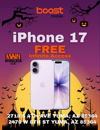 Apply today and get the new iPhone 17 here !! Boost mobile 2718 S 4TH AVE YUMA, AZ 85364. Pay only $65 For Unlimited Service. Available!! Monday - Saturday 10:00am - 7:00pm Sunday - 12:00pm - 5:00pm