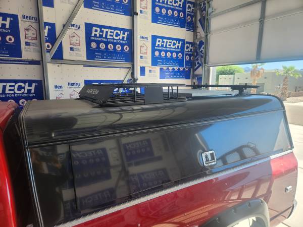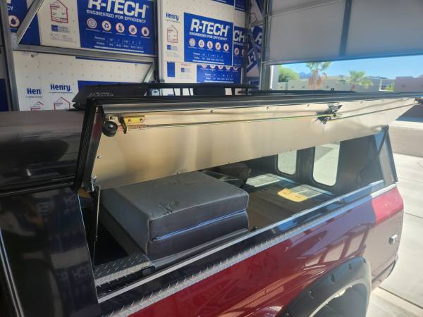 New in 2022 Leer camper shell. Front sliding glass window. Opening side door both sides. Great for front of bed access. Double doors with windows rear. Roof rack tracks on roof. Cargo basket. 100 watt solar panel. Mount on rear of track for awning (with drop side). All removable. Unit built for 2006 Dodge long bed. Unit set up for remote hunting and campimg.
