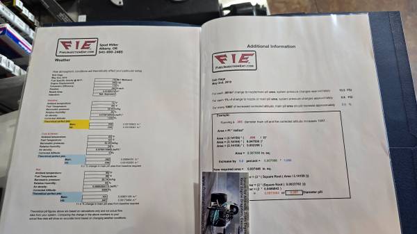 Full paperwork from Fuel Injection Enterprises with flow rates, specifications, nozzle sizes etc. is pictured and included.