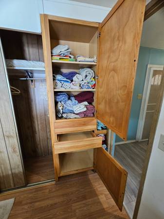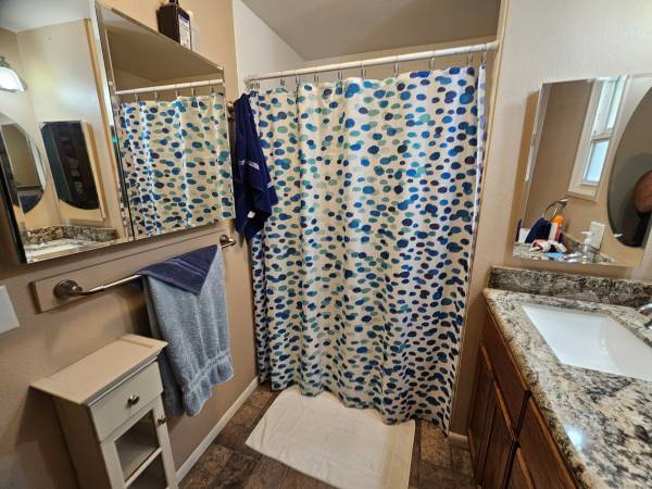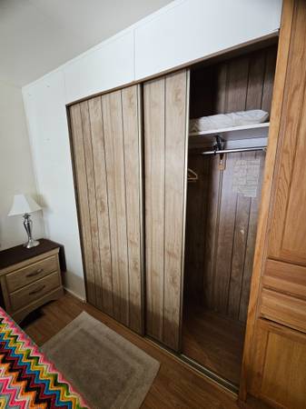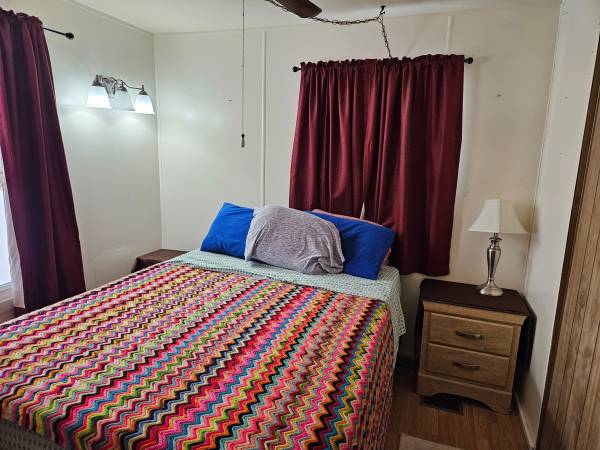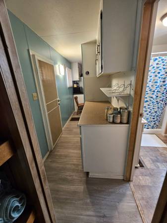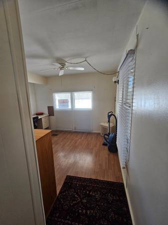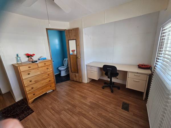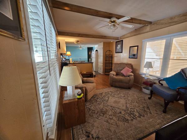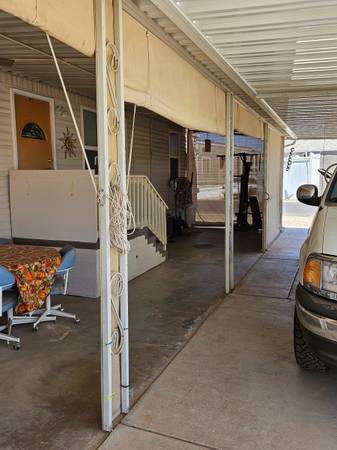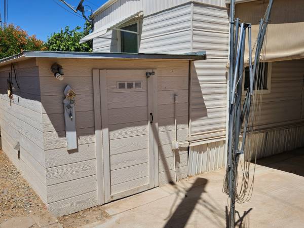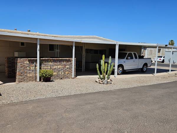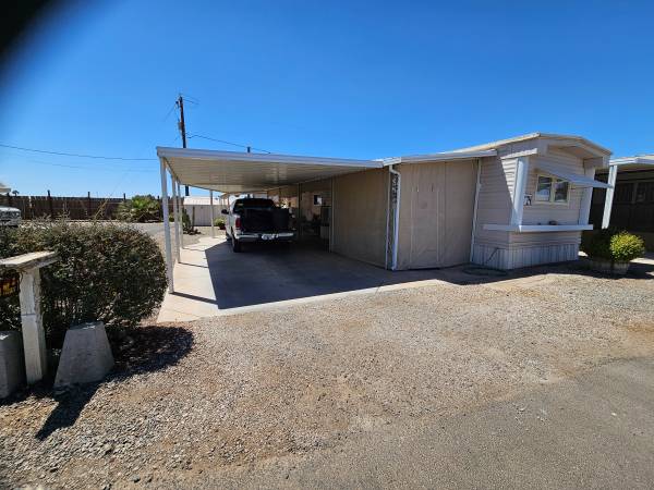 Beautiful upgraded 2 bedroom one and a half bath mobile home. All hardwood floors thru out . Double pane windows, all new blinds. Furnished with tons of storage. Home is located in 55 older park. Home has huge arizona room with many privacy screens. Covered parking for 2 plus vehicles. Bricked in Bbq area with power and covered. This is a large lot at back of park. Very quiet and private. Property has two sheds. One with brand new washer and dryer utility sink and water softner. Other shed has some shelves built in with power also. Dogs welcome and very close to golf , parks and the colorado river.