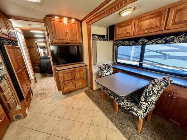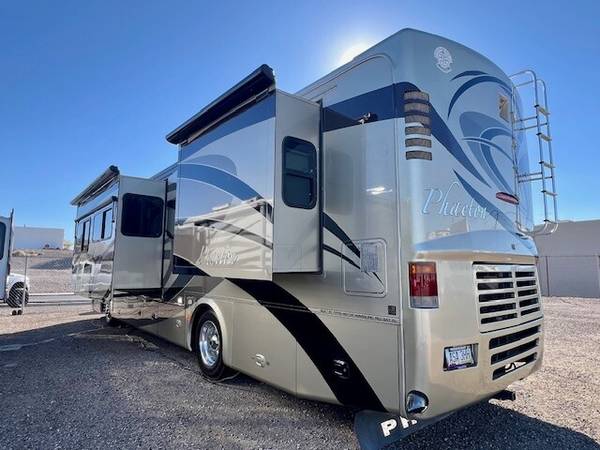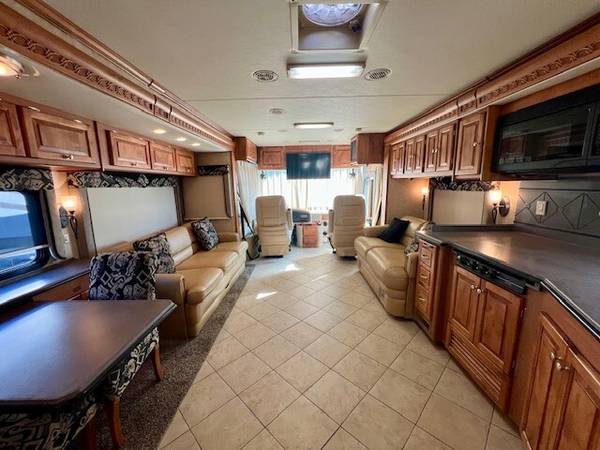 NEW 6 VOLT BATTERIES!!! 2007 Tiffin Allegro Phaeton 36QSH 4 Slides, 350 CAT diesel, 45k, Allison 6 speed transmission, Auto leveling, Full body paint, pass thru storage with sliding tray, outdoor entertainment, 7.5 kw Onan® Manual Slide-Out Generator, Two 15,000 BTU Low Profile Roof Air Conditioners with Heat Pumps, Dual fuel fill, Dual Pane Windows, Back up camera with sound, side cameras, electric patio awning, slide out awning, window awnings, entry door awning, Rock Guard mud flap, ladder, walk on roof, Front entertainment center with surround sound, DVD, Adjustable captain s chairs for comfortable seating in living quarters, 74 Leather Sofa sleeper, 62 Leather sofa sleeper, living room TV s both updated, Satellite in motion DISH, surround sound system, free standing dinette, solid surface counter tops, pull out cutting station, convection microwave, automatic fan, gas grill cook top, 4 door fridge with ice maker, kitchen entertainment updated TV, linen closet, Spacious shower, separate toilet and sink, vanity sink in bedroom, walk around queen mattress, master closet, Spendide washer and dryer combo, TV, 2 AC s dual zone, day and night shades, Tile flooring. Clean inside and out. Newer tires, newer batteries, New engine batteries. Just was fully serviced, Slides serviced all recalls done, K N filter, oil change, Generator full service. Captains chairs show wear. Overall the coach is clean and in excellent shape. Coach is clean and in overall very sound. No dealers. I can help with financing if needed, Title in Hand. Clean Title In Hand. WILL TRADE FOR CLASS B OR CLASS C TIFFIN WAYFARER OR CLASS B MERCEDES DIESEL SPRINTER