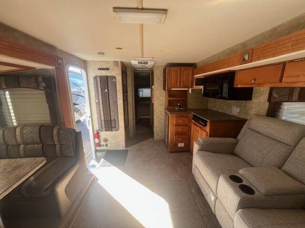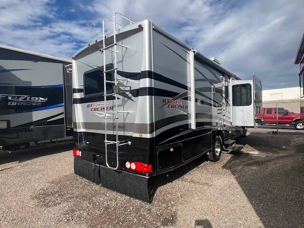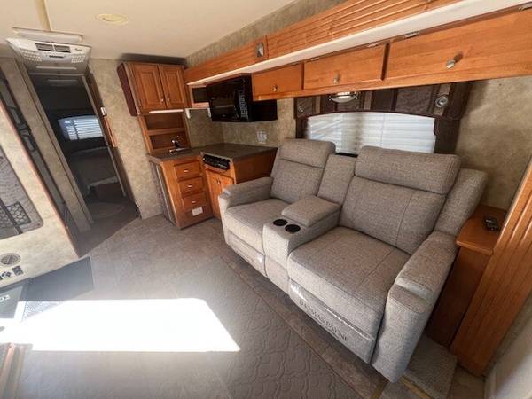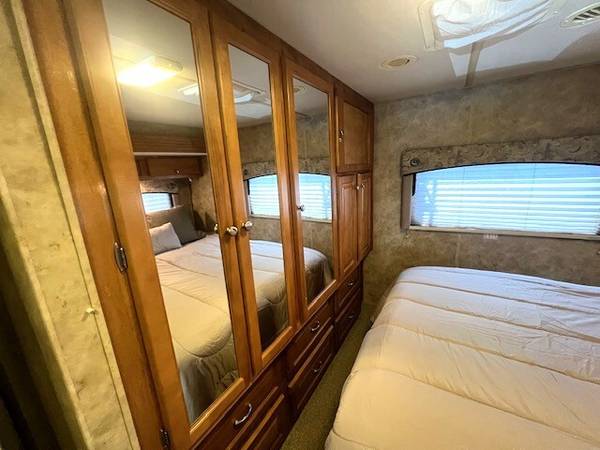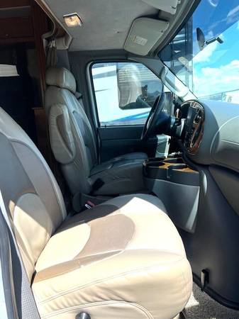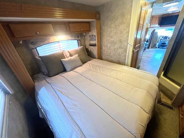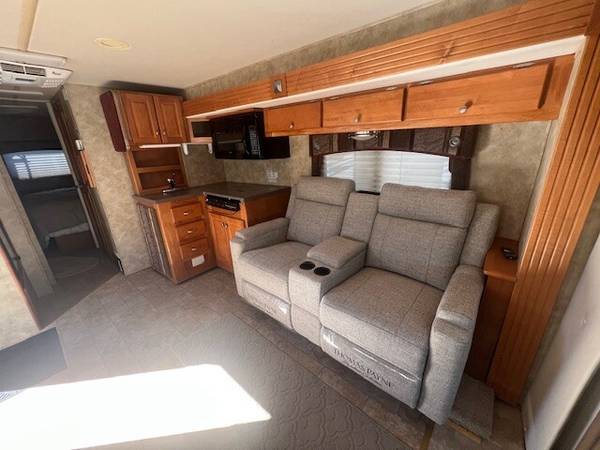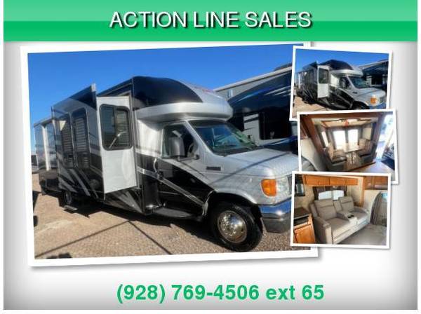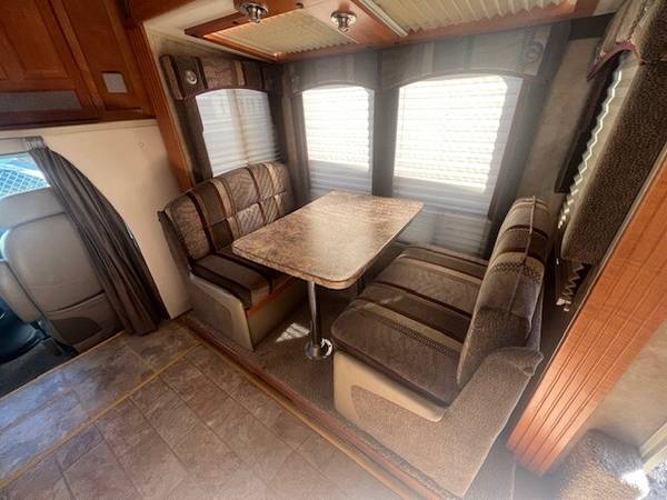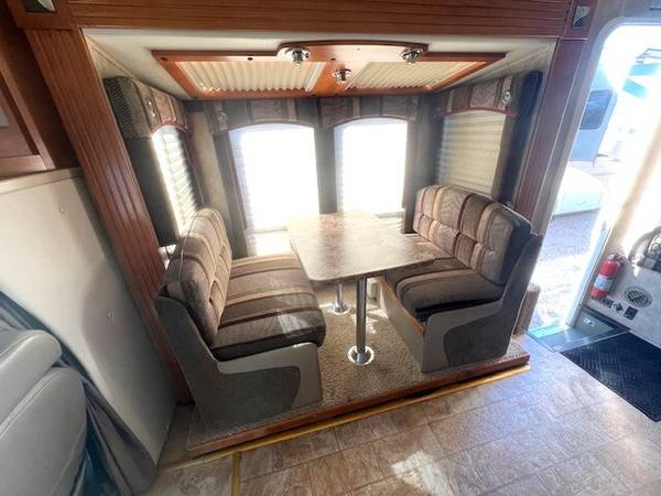 3 Slides, Sleeps 4, Ford V10 Engine, 44k, Back up camera, AT, Power mirrors, stereo system, Upgraded TV, New AC, Recliners, booth dinette with skylights, Nice open floor plan makes it comfortable to entertain guests, Satellite system for dish, Roof just resealed, patio awning, Slide toppers, Generator with low hours 282, fridge, sink covers, solid surface counters, spacious shower, separate toilet and vanity, walk around queen bed, linen closets and drawers, storage under bed, no smokers in great shape inside and out. Captain chair is peeling lightly. Roof just recoated and maintained.