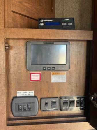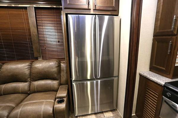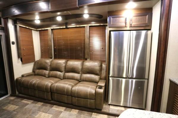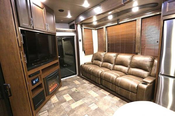 This 2016 Keystone Fuzion Chrome 420 is a luxurious fifth wheel that offers unparalleled comfort and entertainment. With its 2 patios featuring gates and stairs, bath and a half, 3 slides, and sleeping capacity for 8, this unit is ideal for families and large groups. Weighing 15,059 pounds dry and 19,000 pounds loaded, this unit also features a 115-gallon freshwater tank. Exterior highlights include a 12-foot garage, 3 electric awnings, a triple axel, a fuel station with 2 tanks, and an Onan 5500 generator. The artic package with tank heaters, automatic 6-point leveling system, and garage patio with slider doors and portable steps further enhance the unit's functionality. Inside, you'll appreciate the open floor plan, complete with a spacious sofa featuring message and heated or cooled recliners, a loft bed, a fireplace, an entertainment center, and a state-of-the-art stereo system with surround sound and Bluetooth connectivity. Additional interior features include solid surface countertops, a Winegard satellite, linen closets, an enclosed bathroom, and a king-sized bed with drawers and linen closets. With its excellent condition, both inside and out, and recent upgrades, including new tires, a new battery, and a new water pump, this unit represents an exceptional value at $65,000. reduced for quick sale.
