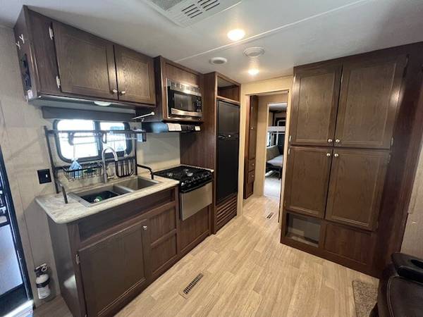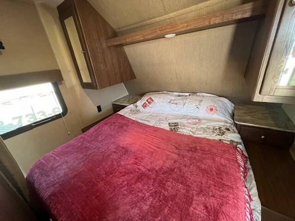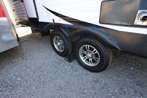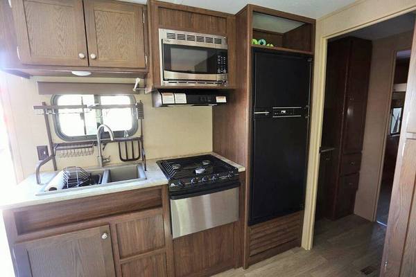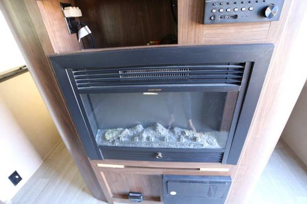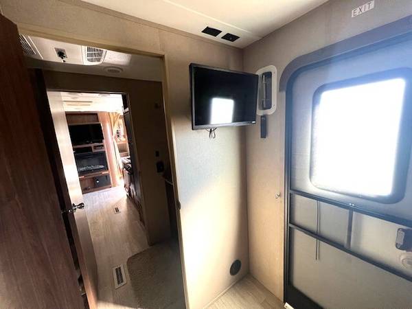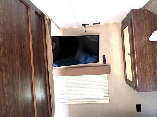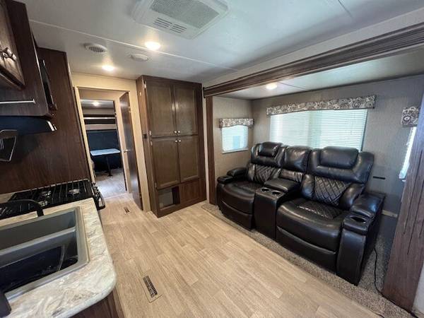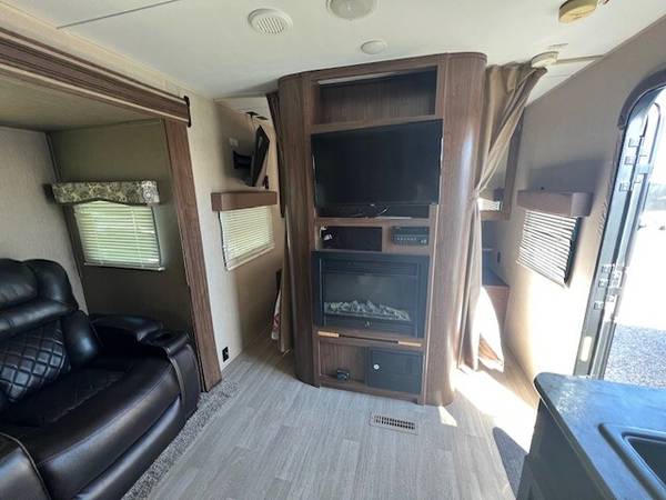10 ft garage, Two separate bedrooms with 2 entry doors, the back bedroom sleeps 4, front bedroom sleeps 2. Has 2 AC's, middle bathroom with shower, Has 3 new TV's, digital antenna, Theater recliners, 30 amp RV, storage cabinets, enclosed bathroom and shower, separate vanity, stainless appliances, Oven, gas grill cook top, microwave, oven, fridge, Fireplace, DVD and CD Player, Electric theatre chairs, queen bed with linen closets. Trailer is clean and no smokers.