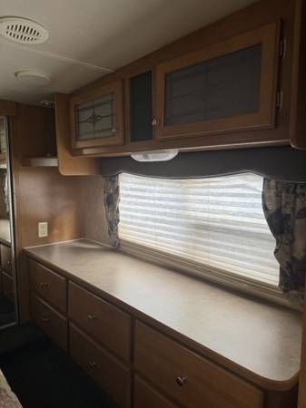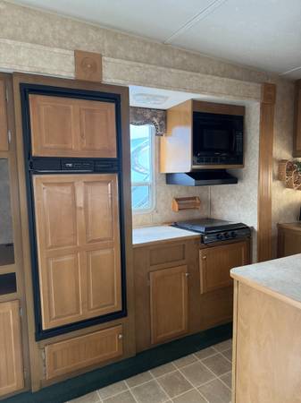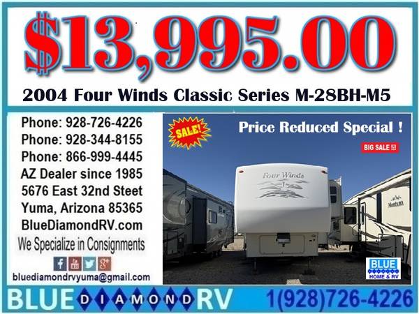 The 2004 Thor Motor Coach Four Winds Series M-28BH-M5 is a 32-foot long, self-contained, fifth-wheel RV that weighs 8,072 pounds and was designed to sleep multiple people. The "BH" in the model name indicates a "bunk house" floor plan, making it ideal for families.