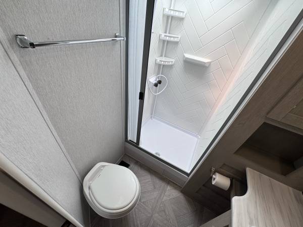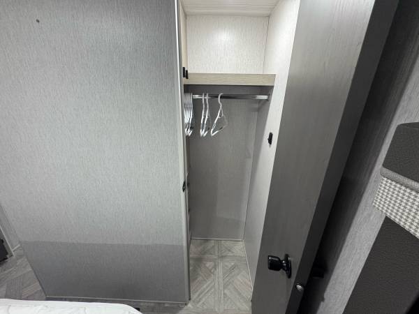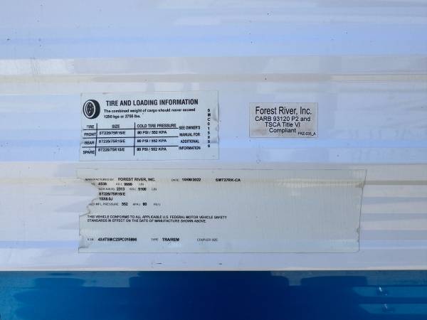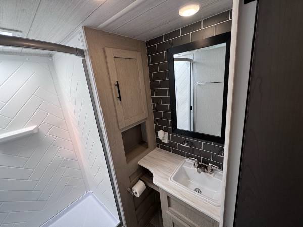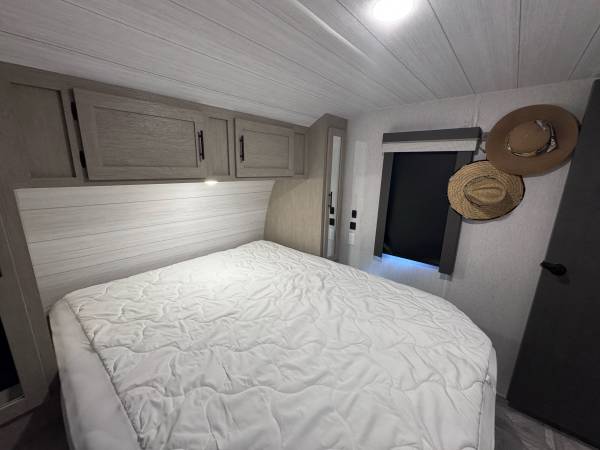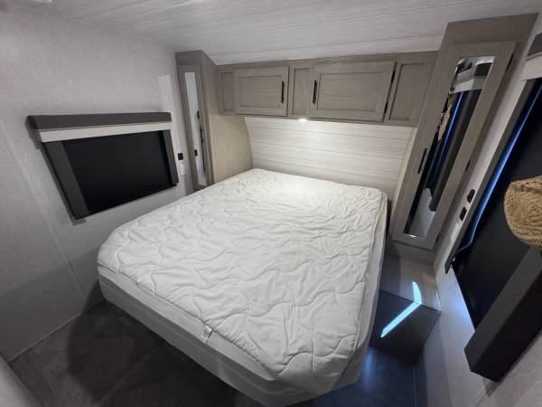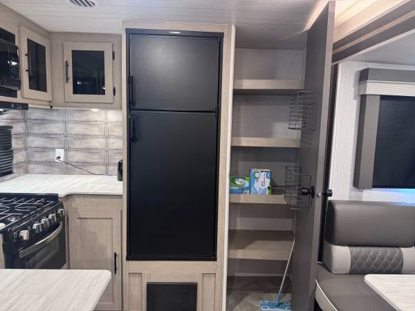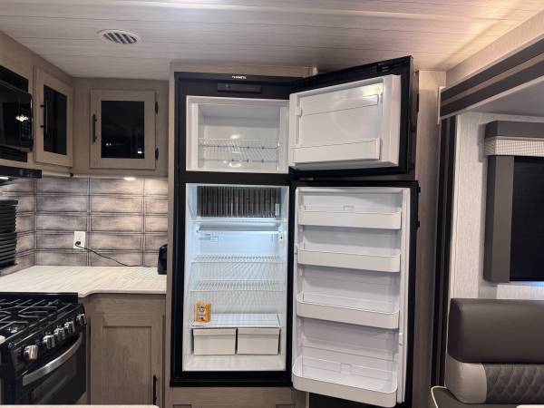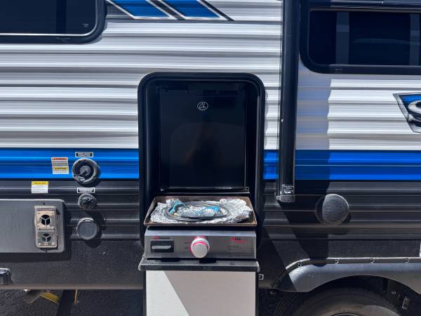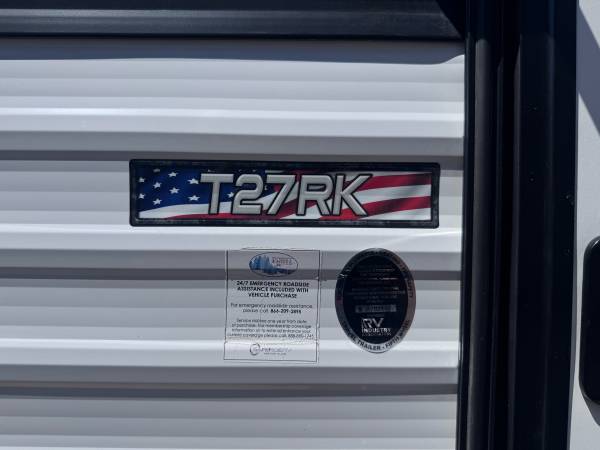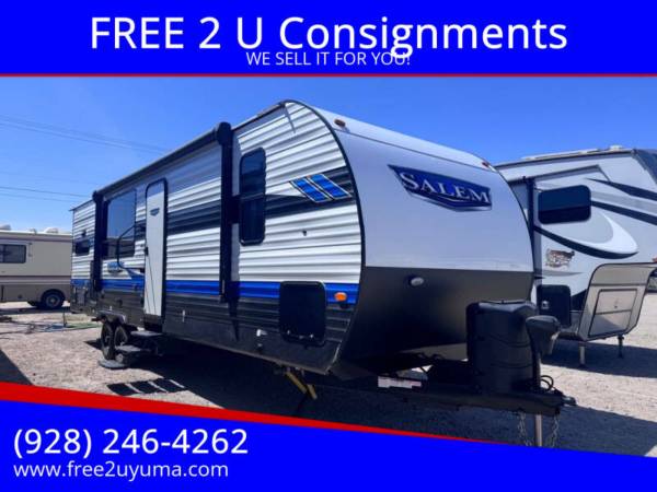 2023 Forest River Salem 27RK Bumper Pull Trailer still in the wrapper! The exterior has an overall length of 33ft on a tandem axle trailer, a 20’ ft awning, electric stabilizer jacks, exterior camp kitchen, and a gvwr of 7,995 lbs. the interior has a huge living area with a slideout. Beautiful panoramic windows with plenty of natural sunlight, 4 seat dining table, plus 2 sofa recliners in front of an entertainment center over the fireplace. The rear kitchen has a 3 burner cooktop, oven, microwave, and refrigerator that all match! The bathroom has a big corner shower with a sliding door, closet for storage and toilet with sink and vanity. The master bedroom has a walk around queen bed with over head closet and a walk in closet! Don’t miss out on this beautiful 23’ Forest River Salem, check it out before it’s gone!