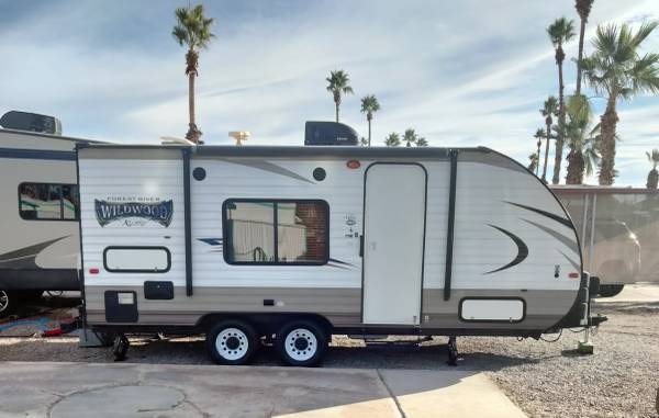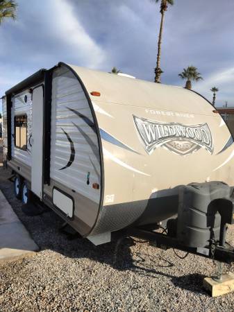 *Forest River 23 foot Wildwood Hyper-Lyte well maintained bumper pull travel trailer, dry weight 4092 lbs, tongue weight 532 lbs., queen bed, electric jack, electric awning, a/c, gas heater, elec/gas refrigerator/freezer, gas stove/oven, microwave, large corner shower, outdoor shower, young tires. $15,000. Yuma, AZ (520) 645-0790.