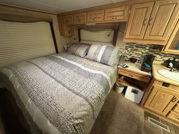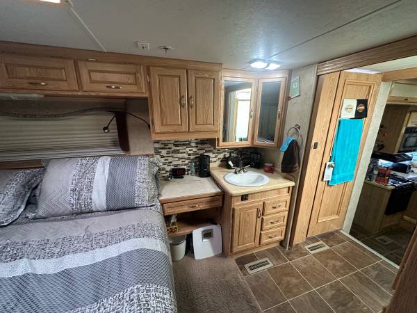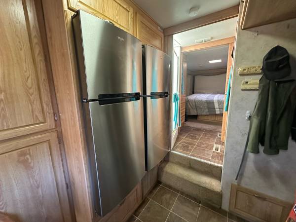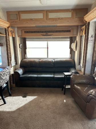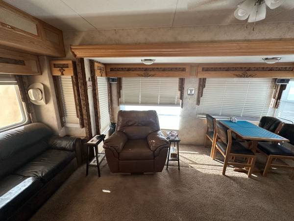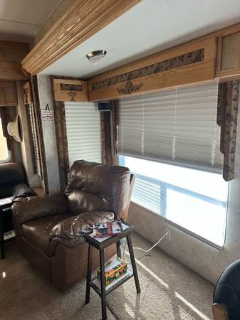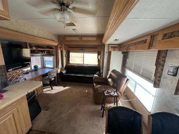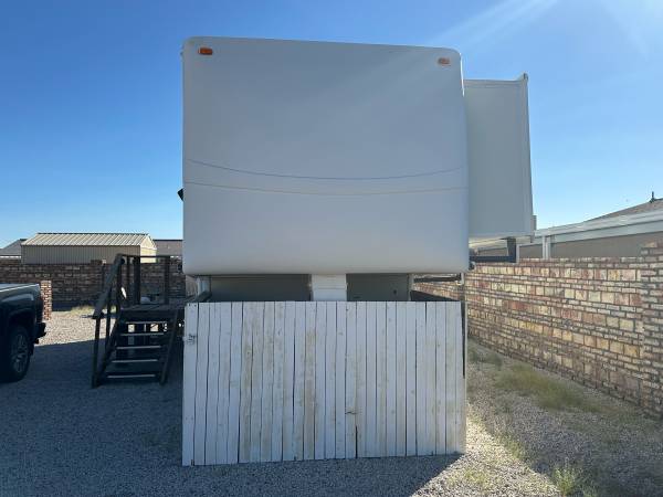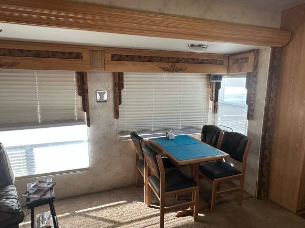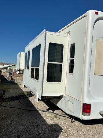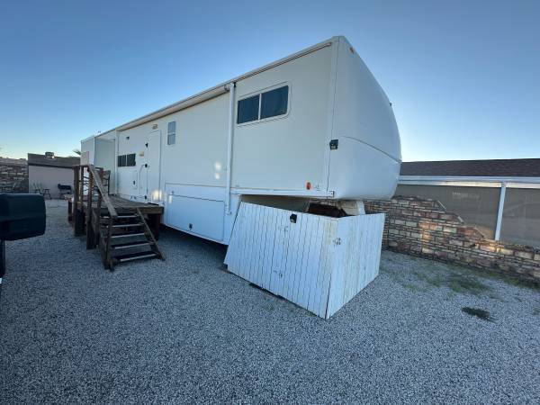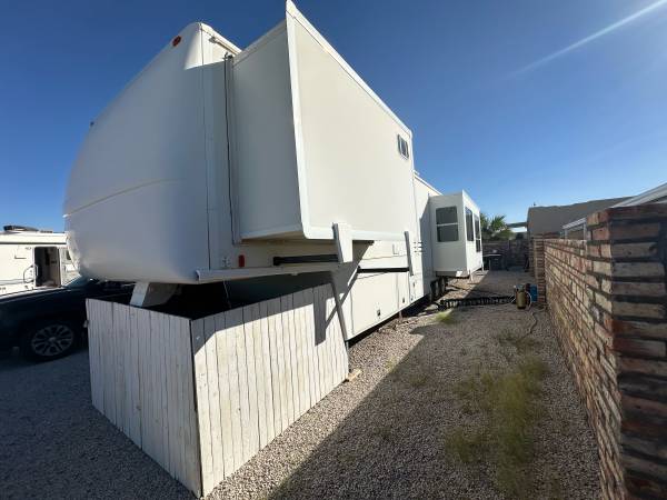 Fifth wheel Well cared for 41 ft trailer with three slides, lots of recent upgrades new celling fan, awning, kingsize mattress, led lighting, surround sound system, two Stainless steel fridge / freezers, toilet, flooring , blinds and window covering and roof has been sealed and recoated. Large shower, wood stairs and deck, hitch support, bow enclosure, includes pots,pans, dishes, utensils, some bedding and towels, appliances and six place patio set. Pretty much everything you need. On a large fenced rental lot with shed $14,500.00