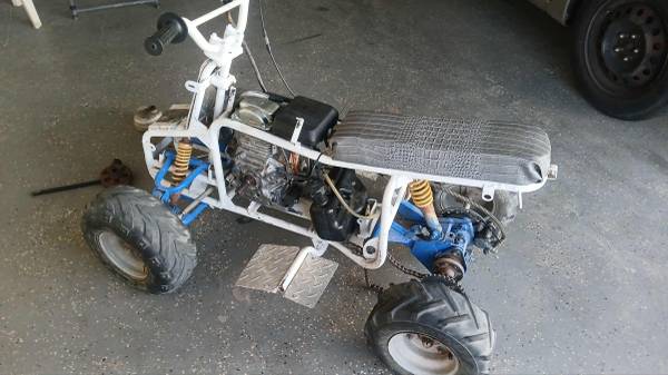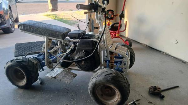 Mini four wheeler is not complete yet but is almost done the only part it needs is a right size sprocket and other things it needs is to wire up the throttle and make holes to fit and bolt it down other than that it has everything it runs has plenty gas if no one buys it right now I'll just finish it myself can come with extra tools to help finish for extra cash 350 obo open to trades for anything feel free to ask any questions