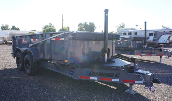 NEW 2026 Diamond C LPT207 14x82 This trailer is a Low Profile Telescopic Trailer, this 14' long trailer and 82" wide trailer has (2) 7K axles, 6- leaf slipper spring suspension, 21K Coupler, passenger side spare mount, 3 way dump gate, 78" slide in ramps, 32" tall sides, 24" side step, tear drop diamond plated fenders, 15K Jack, Hydraulic up/ Gravity down dump, solarpulse charging system (7 WATT), (4) tie downs, and 20' Heavy duty mesh tarp with long arm.