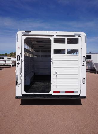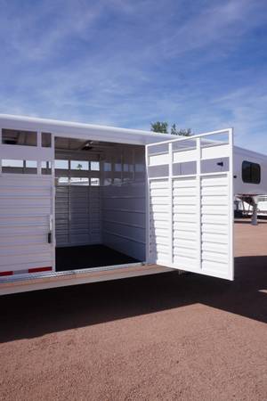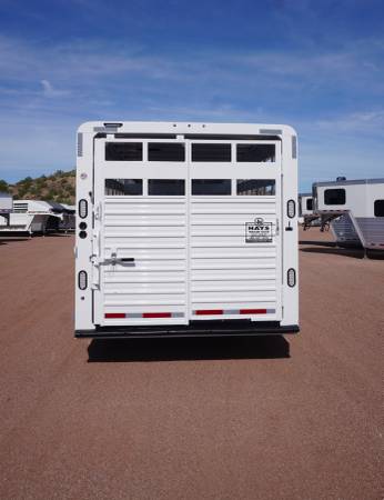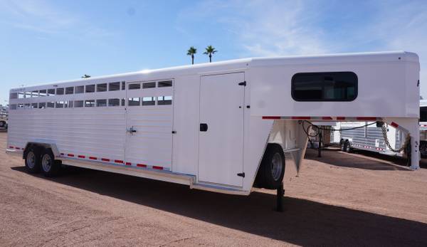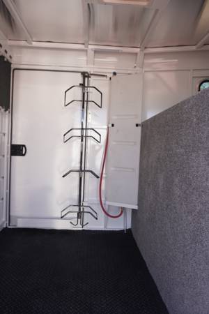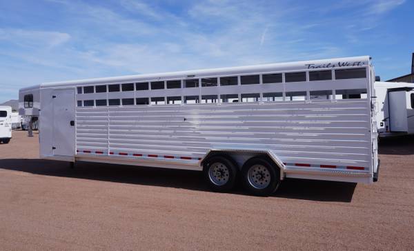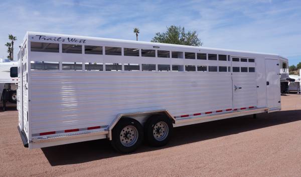 NEW 2026 Trails West Hotshot 29' Straight Tack Package This trailer is 7'6 Wide and 7' tall. This trailer features one piece aluminum roof, EXTRA door to tack room on driver's side, rear slider gate, aerodynamic bullet nose, rubber bumper, and passenger side escape door. Stock area has rubber floors, straight center slam latch divider and pop up vents. Tackroom has tack organizer, (2) 4 tier swing out saddle rack, brush tray, water tank, blanket bar, many bridle hooks, and bus windows on each side of gooseneck.
