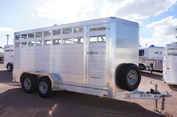 NEW 2022 Eby Maverick LS 16' Stock Trailer This trailer is 6' wide 7' tall. This trailer features 10K GVWR, slated sides, 2-5/16" coupler, flat diamond plate flooring with floor mats added, passenger side escape door, full swing rear gate w/ sliding calf gate, Full hinged gate- centered, and spare tire.