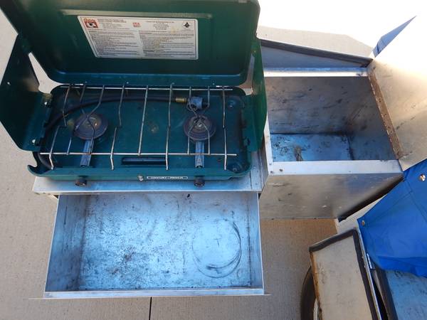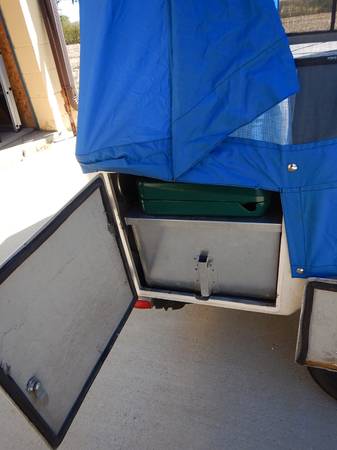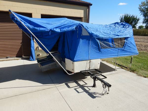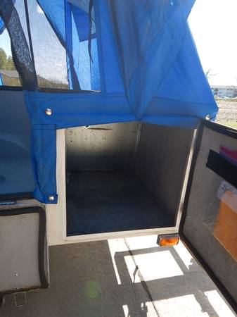 1998 Scooter Schooner Motorcycle Camp Trailer. Very clean. Fiberglass body, queen bed, inside dinette, outside kitchenette with camp stove. Travel cover. $2000 obo